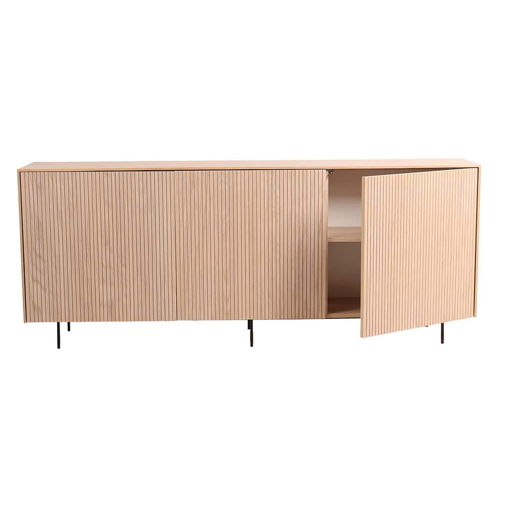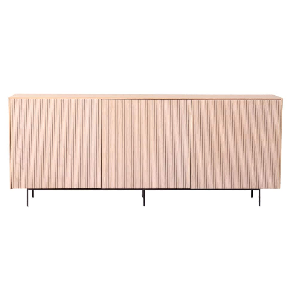 Dette stilige skapet med lyse trefinish og diskret linjemønster innkapsler den moderne skandinaviske estetikken. Skapet står støtt på tynne, svarte metallben som gir det en lett og luftig følelse, samtidig som det gir stabilitet og holdbarhet. Med sitt minimalistiske design og varme tretoner blir skapet et naturlig midtpunkt i ethvert rom – perfekt for stuen, soverommet eller hjemmekontoret.