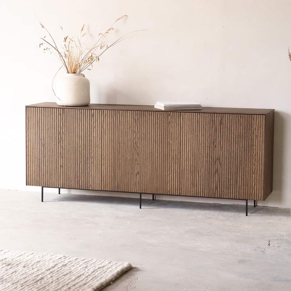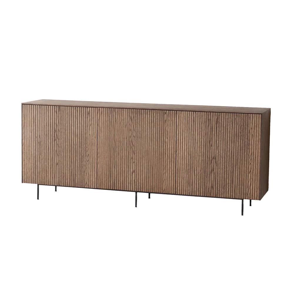 Dette stilige skapet med mørk trefinish og diskret linjemønster innkapsler den moderne skandinaviske estetikken. Skapet står støtt på tynne, svarte metallben som gir det en lett og luftig følelse, samtidig som det gir stabilitet og holdbarhet. Med sitt minimalistiske design og varme tretoner blir skapet et naturlig midtpunkt i ethvert rom – perfekt for stuen, soverommet eller hjemmekontoret.