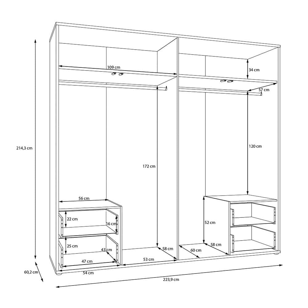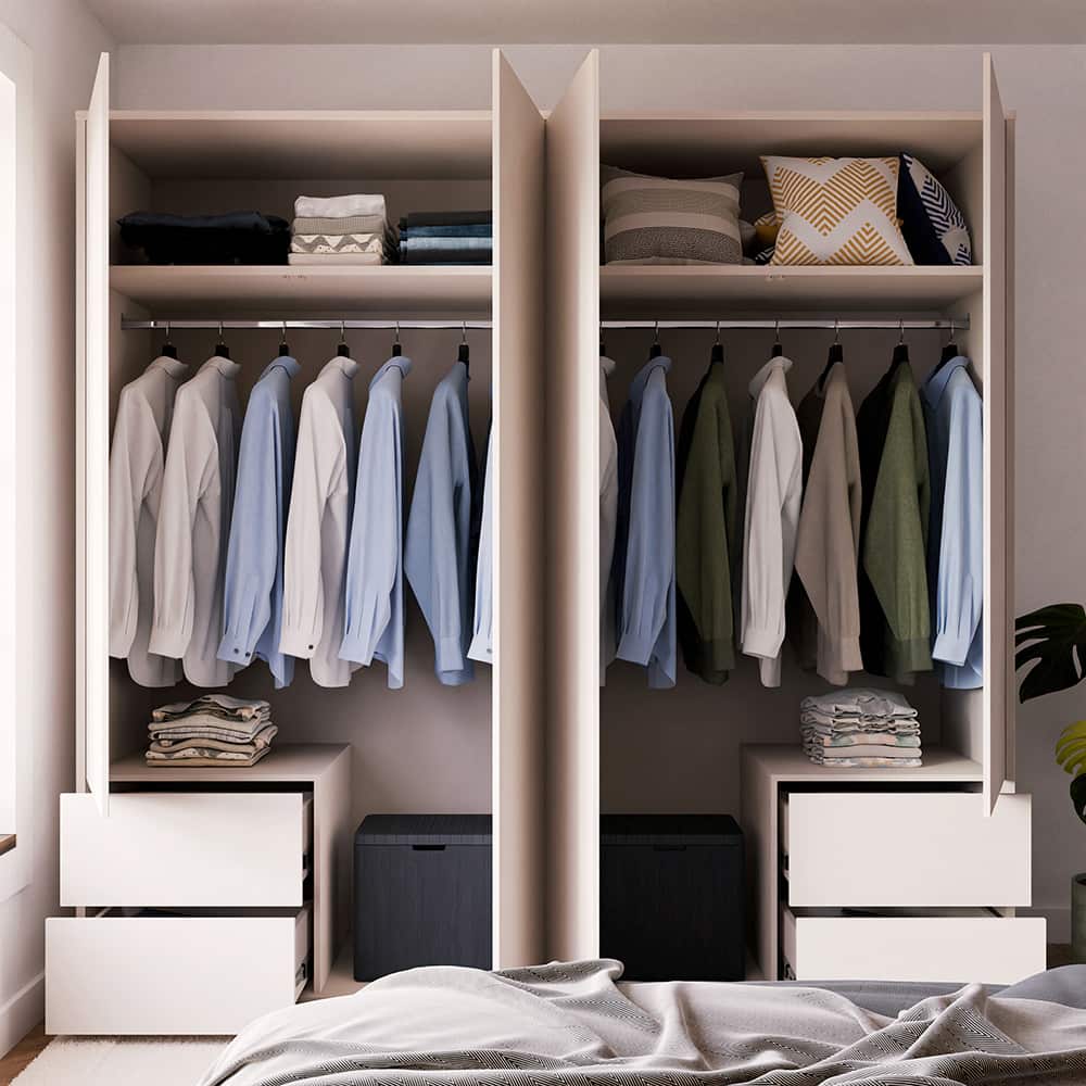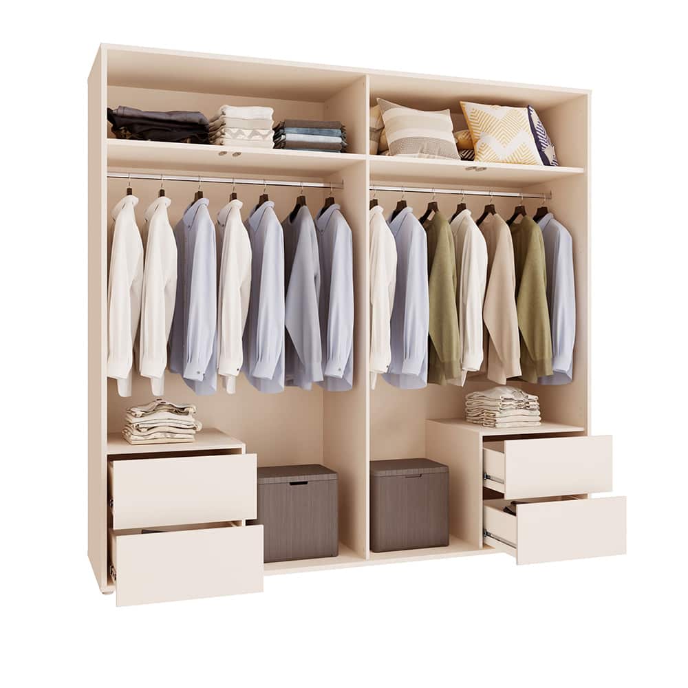 ALICE SPRINGS garderobeskap gjør det enkelt å skape god oppbevaringsplass for to personer. De romslige topprommene er ideelle for sesongklær og oppbevaringsbokser. Innvendig finner du to klesstenger, hver med en maksimal belastning på 25 kg. To skuffer gir praktisk plass til undertøy og mindre tilbehør. Den ekstra flaten over skuffene kan brukes til bl.a. vesker eller ryggsekker.