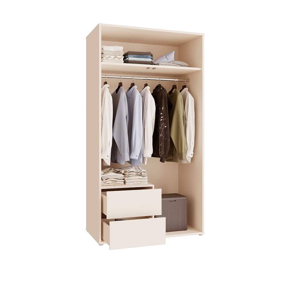 ALICE SPRINGS garderobeskap har et oversiktlig og godt organisert interiør, der hvert plagg får sin plass. Klesstangen har en maksimal belastning på 25 kg. Hver skuff (maks 5 kg) gir praktisk oppbevaring av små tilbehør eller undertøy. Ved montering kan du selv velge om skuffeseksjonen skal plasseres på høyre eller venstre side.