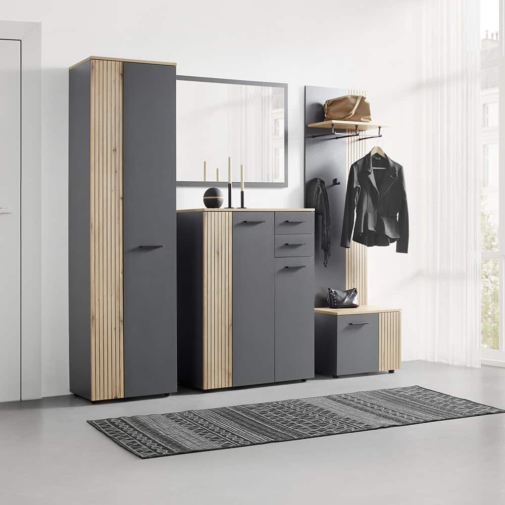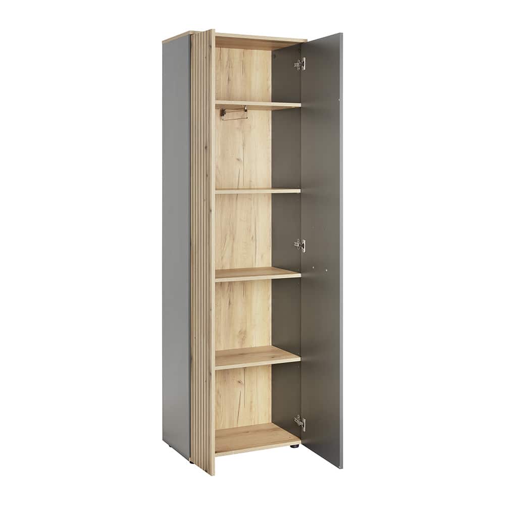 Inne tilbyr CADIX-garderoben nok plass til klær og tilbehør. Den har hengslede dører med hengsler på venstre og høyre side og 3 hyller. Føttene er omtrent 2 cm høye. Hyllene er laget av trebasert materiale og kan hver lastes med opptil ca. 5 kg. Skapets dimensjoner er ca. 60 x 195 x 36 cm (B x H x D).