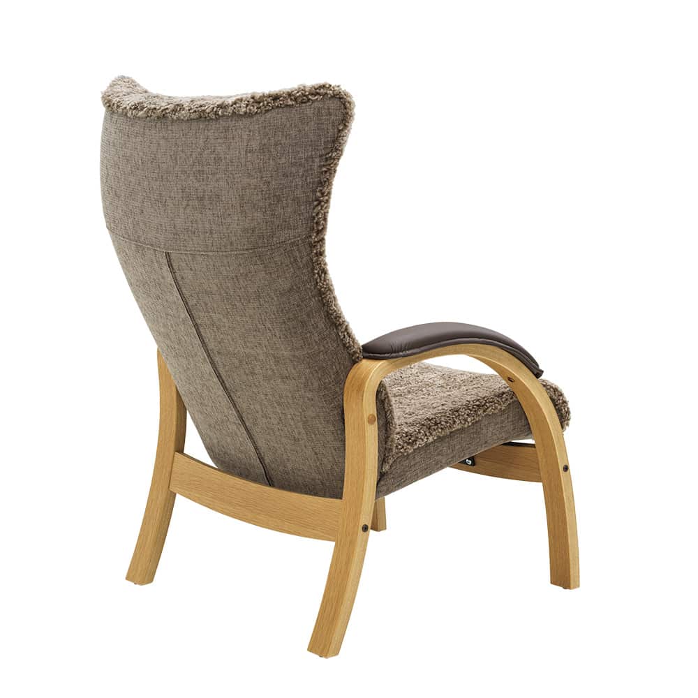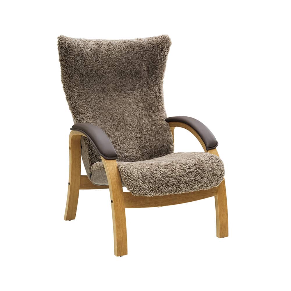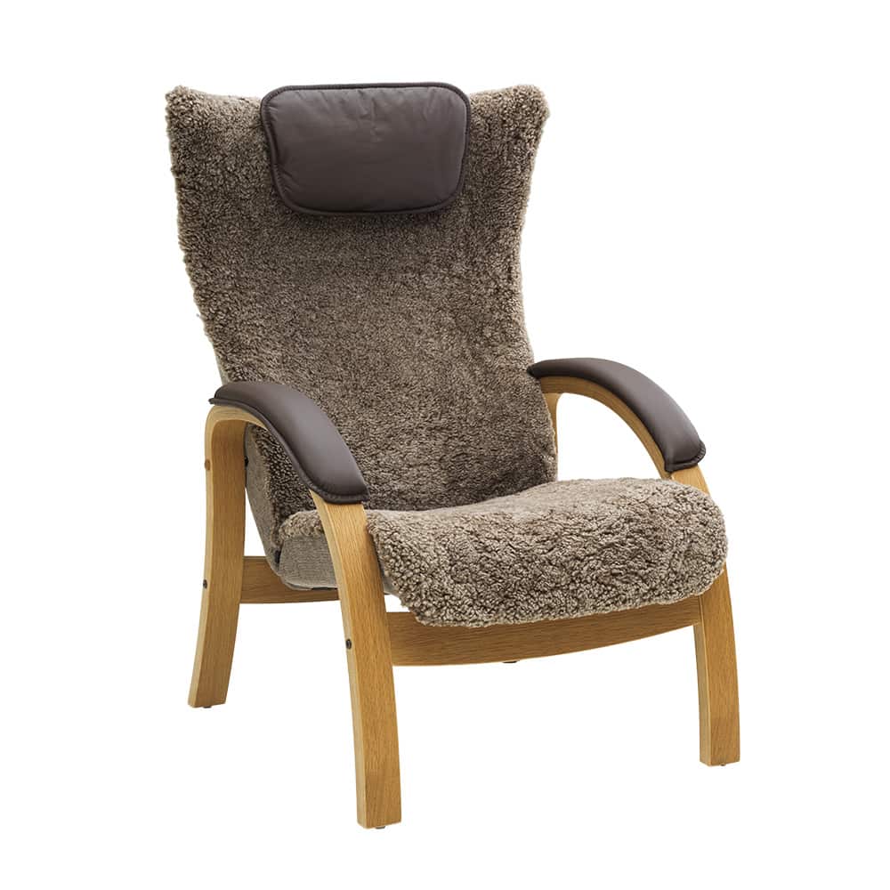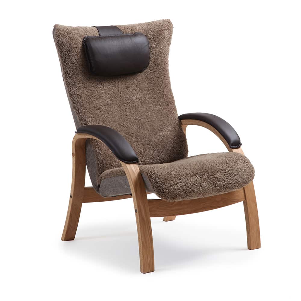 Stolen leveres med ramme i hvitoljet eik, og kan også bestilles i oljet eik med armstøtteputer for ekstra komfort. Matchende fotskammel fås med de samme valgene, og nakkestøttepute kan kjøpes som tilvalg.
