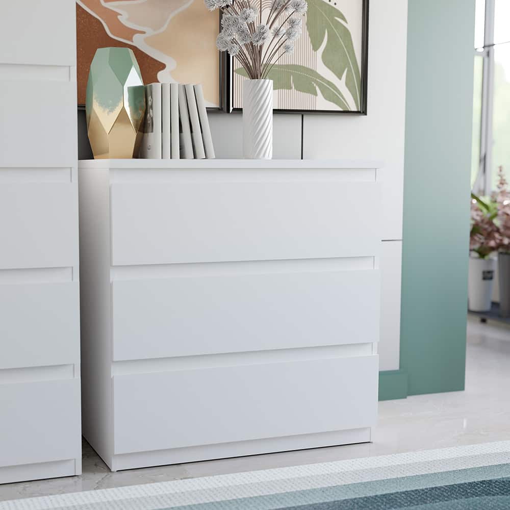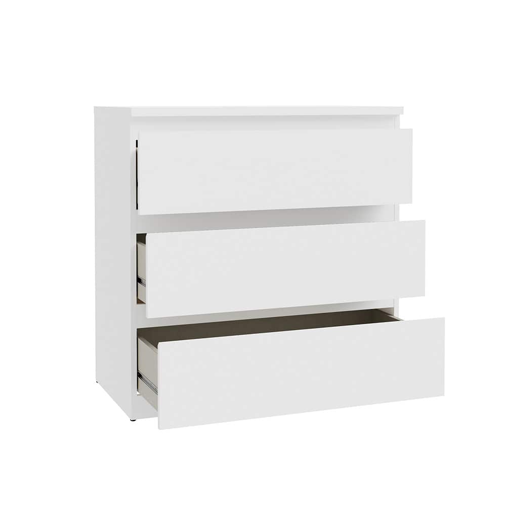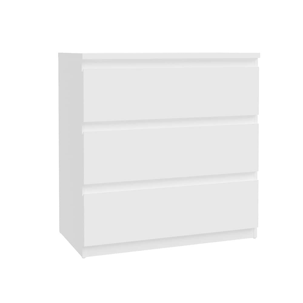 Den kommoden med 3 skuffer er et funksjonelt møbel som vil fungere godt i mange rom, som soverom, stue, hjemmekontor eller gang. Tre romslige skuffer gir god plass til oppbevaring av klær, tilbehør eller dokumenter, noe som bidrar til å holde orden. Plasser favoritt dekorasjonene, bildene og suvenirene dine på toppen, noe som vil gi den ensartede kommoden en dekorativ karakter. Subtile håndtak i form av freser på frontene og et minimalistisk design gjør at kommoden passer inn i ulike arrangementer, noe som tilfører eleganse og letthet til interiøret.