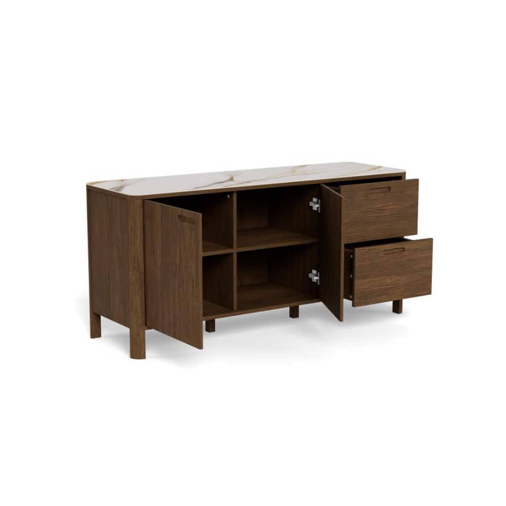 Den dype, rike tonen i den røkte eikefinéren og den polerte kremfargede keramikken med subtile årer skaper en visuell følelse som vekker sansene. Med keramisk topplate og solide, firkantede ben vil denne skjenken tilføre rommet eleganse. Med to skuffer og to hyller, skjult bak de to dørene, tilbyr den også rikelig med lagringsplass.
