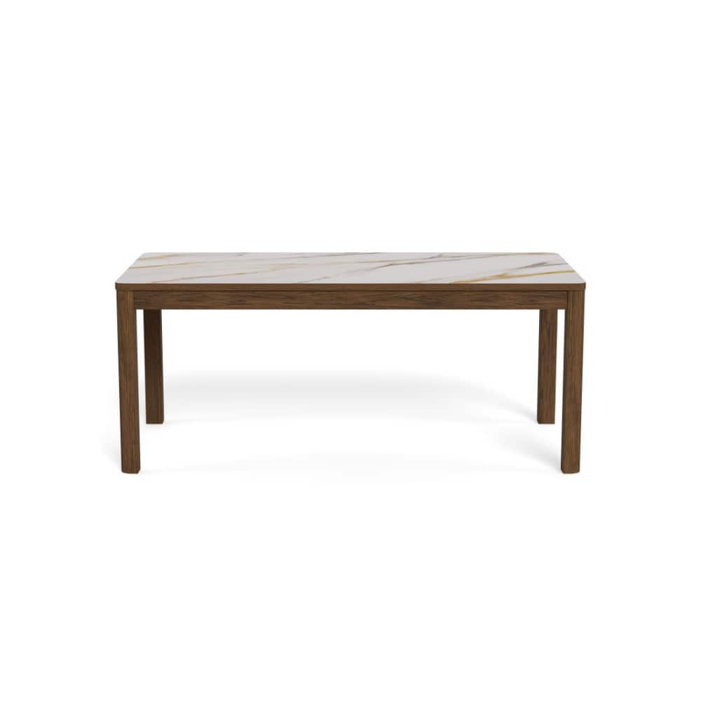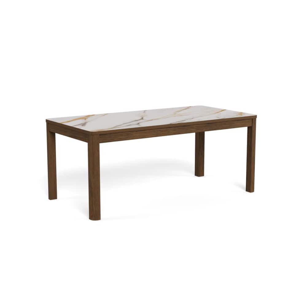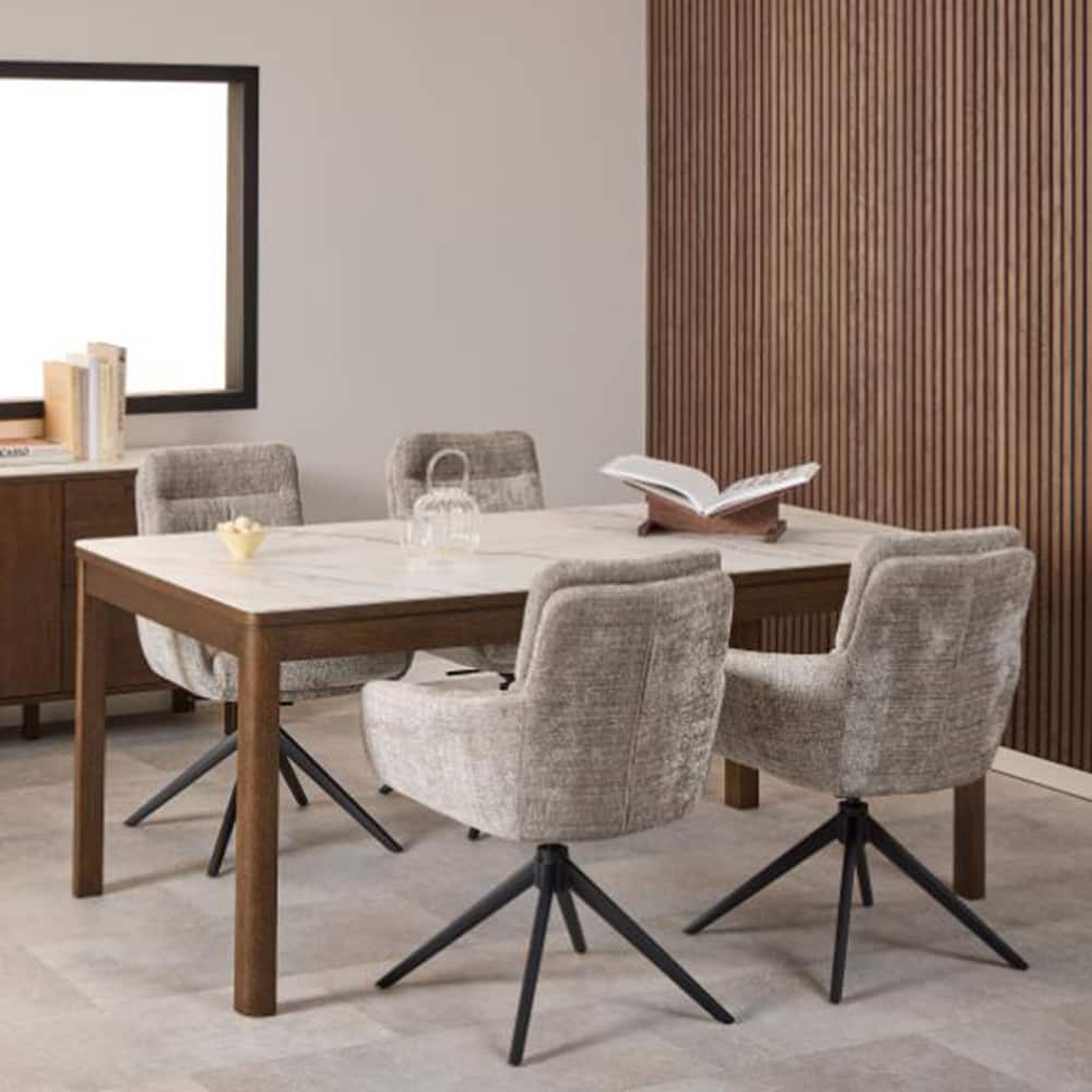 Den dype, rike tonen i den røkte eikefinéren og den polerte kremfargede keramikken med subtile årer skaper en visuell følelse som vekker sansene. Med rektangulær bordplate og solide, firkantede ben vil dette spisebordet tilføre rommet eleganse. Det har komfortabel plass til 6 personer.