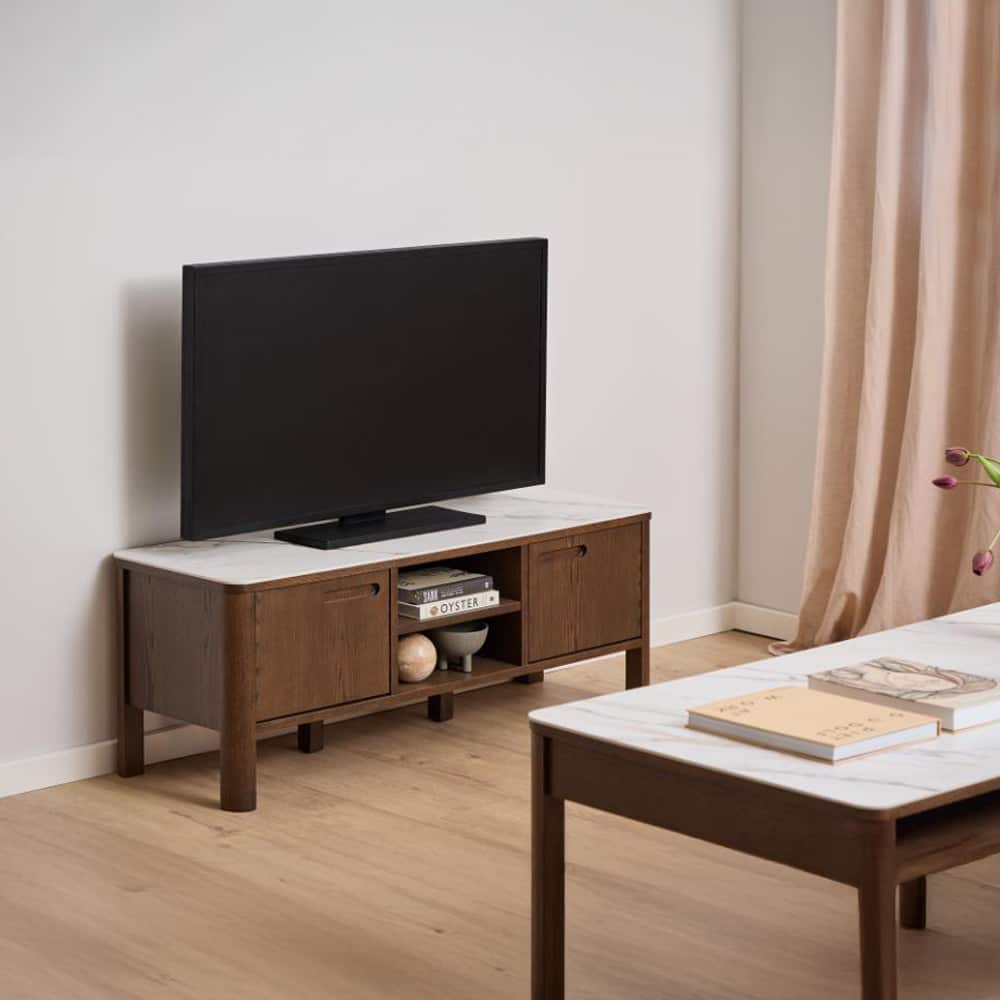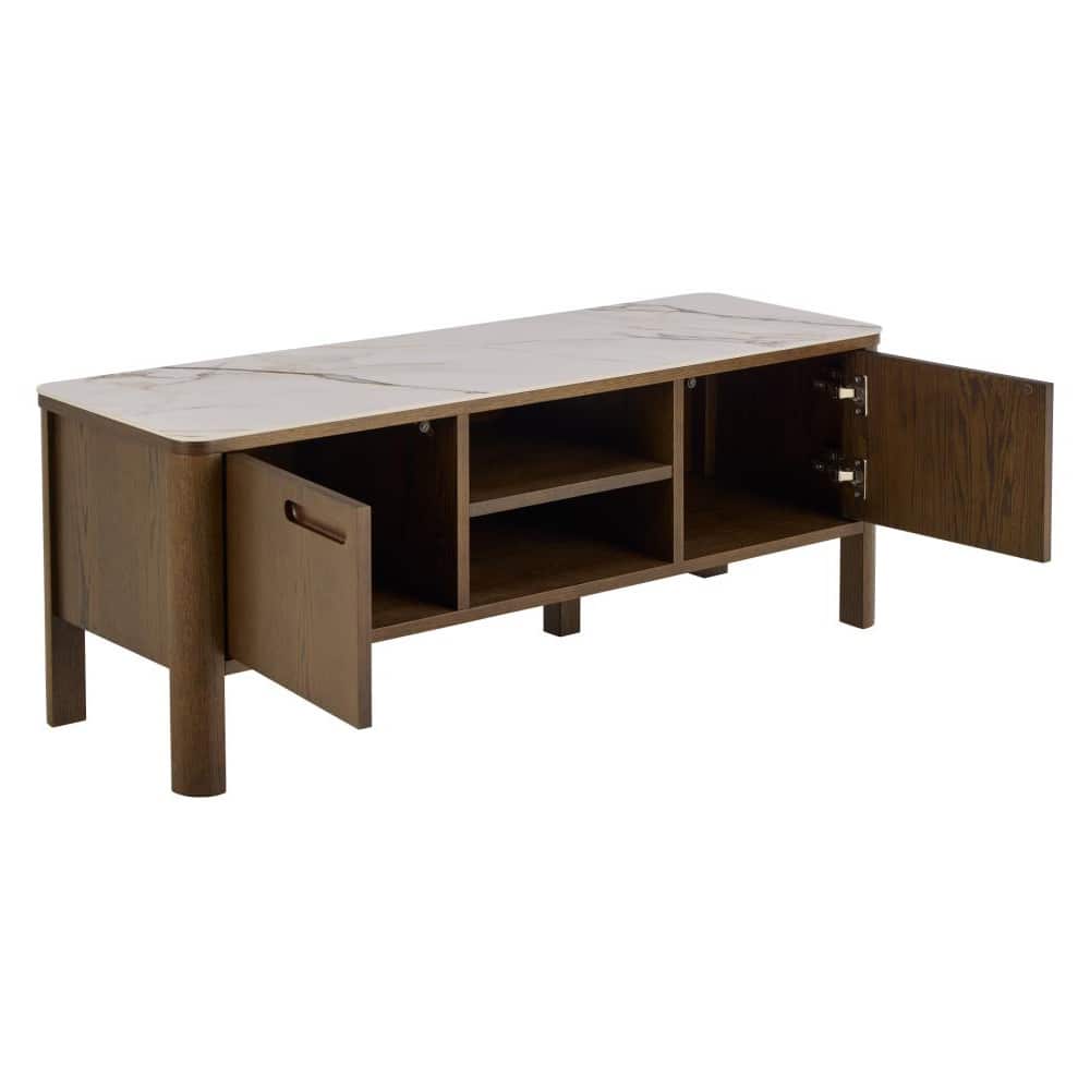 Den dype, rike tonen i den røkte eikefineren og den polerte, kremfargede keramikken med subtile årer skaper en visuell opplevelse som vekker sansene. Designet med en keramisk topplate og solide, firkantede ben vil denne TV-benken komplettere rommet med sin eleganse. Den tilbyr både åpen og lukket oppbevaring, noe som gjør det enkelt å holde orden.