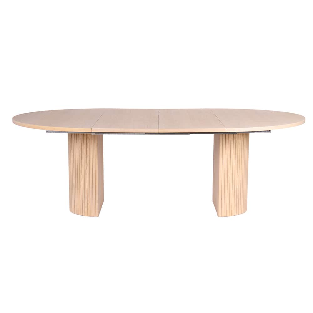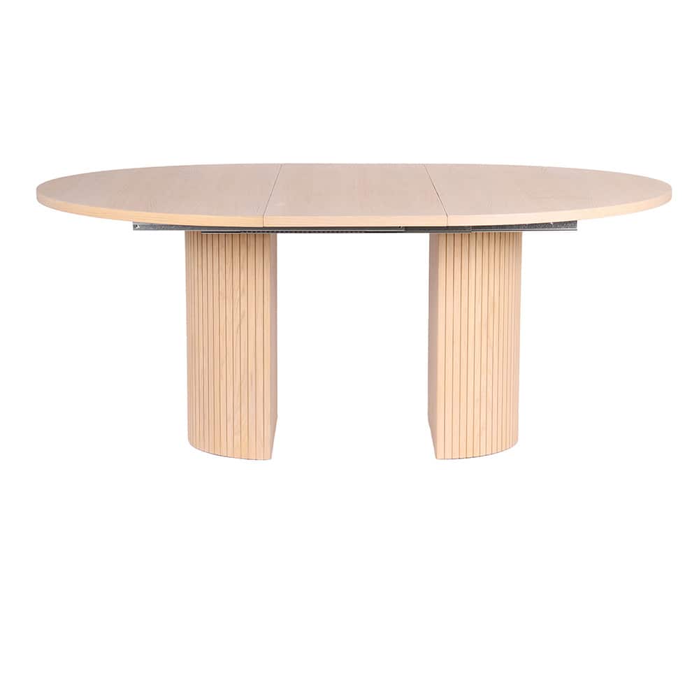 Et stilig og praktisk spisebord i hvitbeiset oljet eikefiner som passer perfekt både i mindre og større rom. Den runde formen skaper en sosial og innbydende følelse, mens søylebasen gir rikelig med plass til stoler overalt. Bordet er 130 cm i diameter og kommer med et matchende ileggsplater som enkelt kan forlenge bordet når du trenger ekstra plass – perfekt for middager med familie og venner.