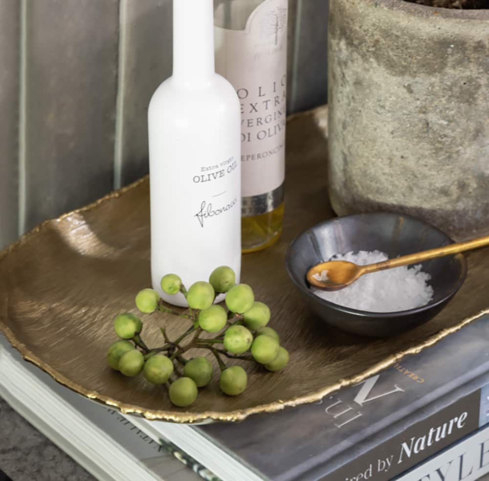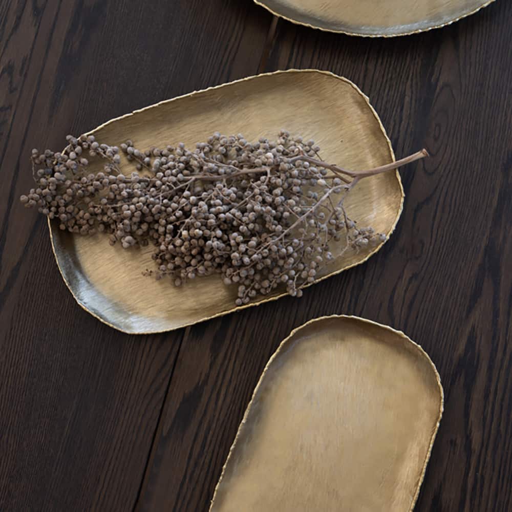 Ines brett med ramme i matt gull finish – en stilren detalj som gir et hint av eleganse til servering eller dekor. Produktdetaljer: 100% aluminium Matt Anti-skliknotter på undersiden Fatene størrelsene: L: 34 cm og 38 cm. Fås også Ø:50 Brettet tørkes fuktig klut Finnes tilhørende vase er del Lama sin kolleksjon