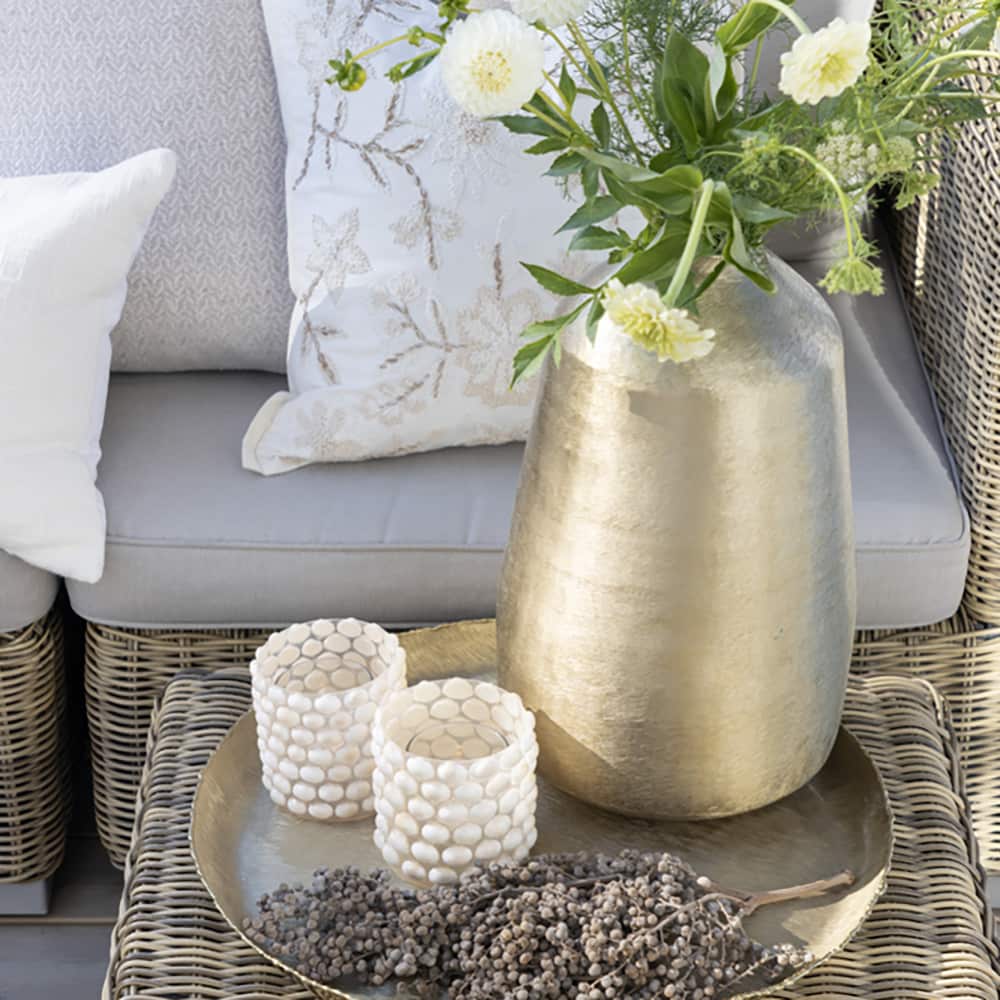 Ines vase i matt gull finish – en elegant og stilren detalj som løfter interiøret. Produktdetaljer: 100% aluminium Matt Vasen er vanntett tørkes av med fuktig klut Finnes tilhørende brett del Lama sin kolleksjon