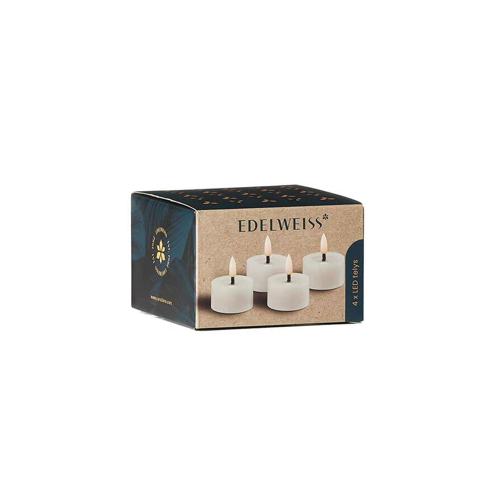 Opplev stemningen Edelweiss LED-lys skaper – utviklet for å gi hjemmet ditt et varmt, ekte og innbydende preg. Den naturtro, blafrende flammen gir følelsen av levende lys, helt uten sot, røyk eller brannfare. Med en vokslignende overflate får lysene et realistisk og elegant uttrykk som passer perfekt i ethvert rom. Kronelysene er utstyrt med en rillet, konet gummikant som sørger for stabil passform i de fleste lysestaker. Lysene kan kombineres med en praktisk fjernkontroll som fungerer på alle Edelweiss LED-lys, uavhengig av variant, stil eller størrelse. Perfekte for å skape hygge, romantikk eller som et stilfullt innslag i interiøret – Edelweiss LED-lys gir deg følelsen av ekte stearinlys, uten kompromisser.