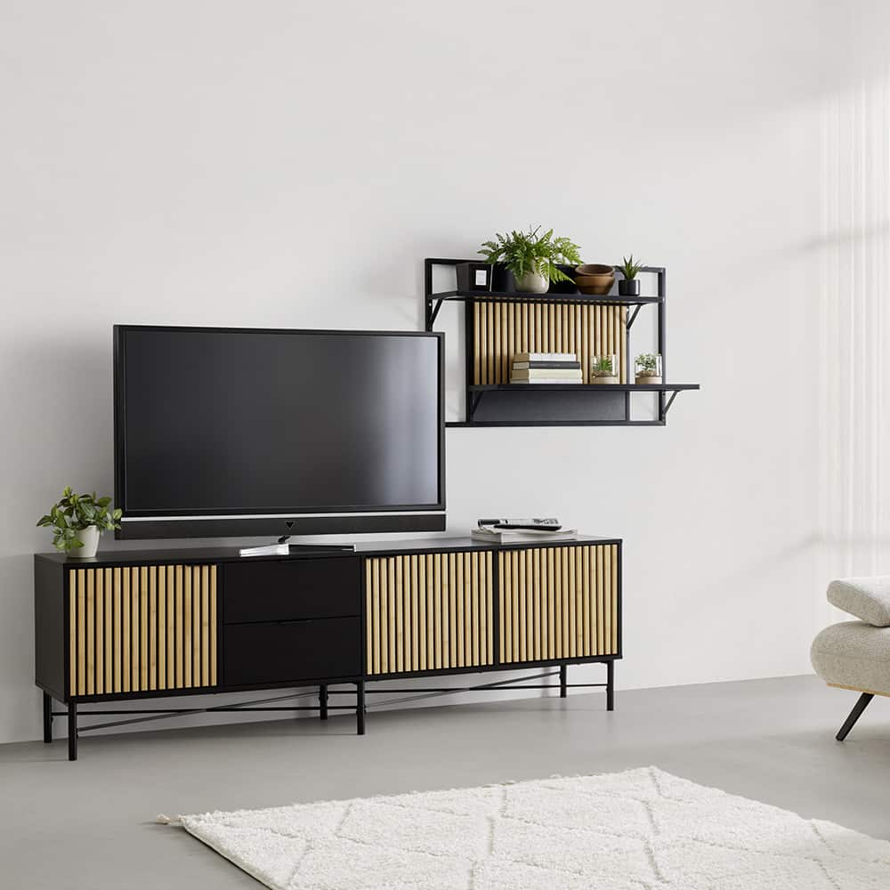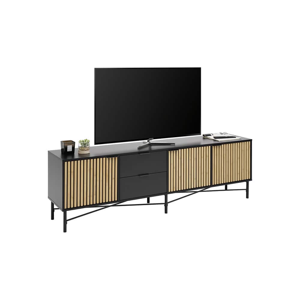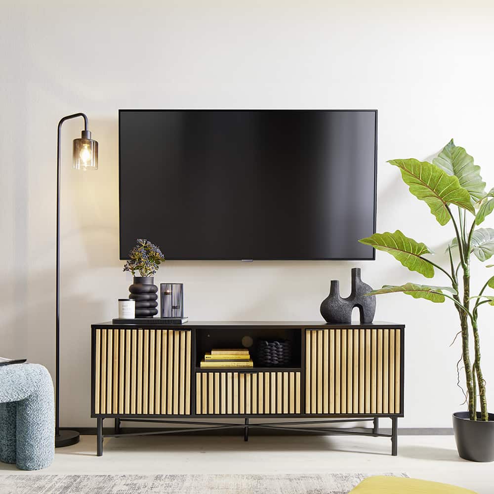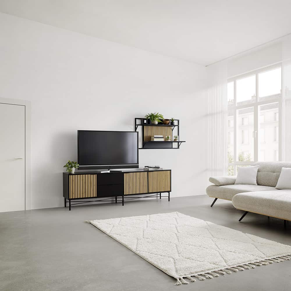 De tre hengslede dørene, hver utstyrt med et soft-close system, sikrer lydløs lukking og gir tilstrekkelig plass til elektronikk, bøker eller dekorative gjenstander. Dørene er fleksibelt designet slik at de kan hengsles både til venstre og høyre for å passe perfekt inn i din bosituasjon. I tillegg har denne lave skjenken to praktiske skuffer i svart, som også er utstyrt med et soft-close-system og gir ekstra oppbevaringsplass.