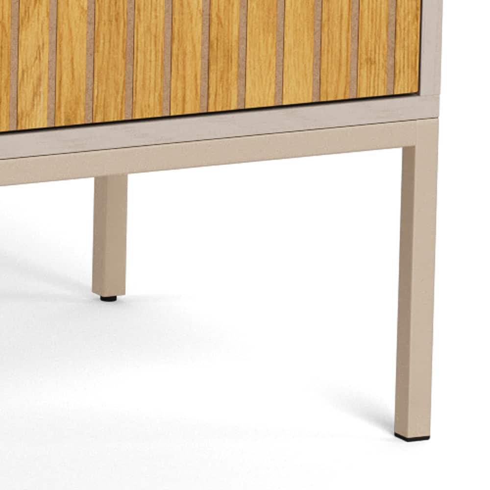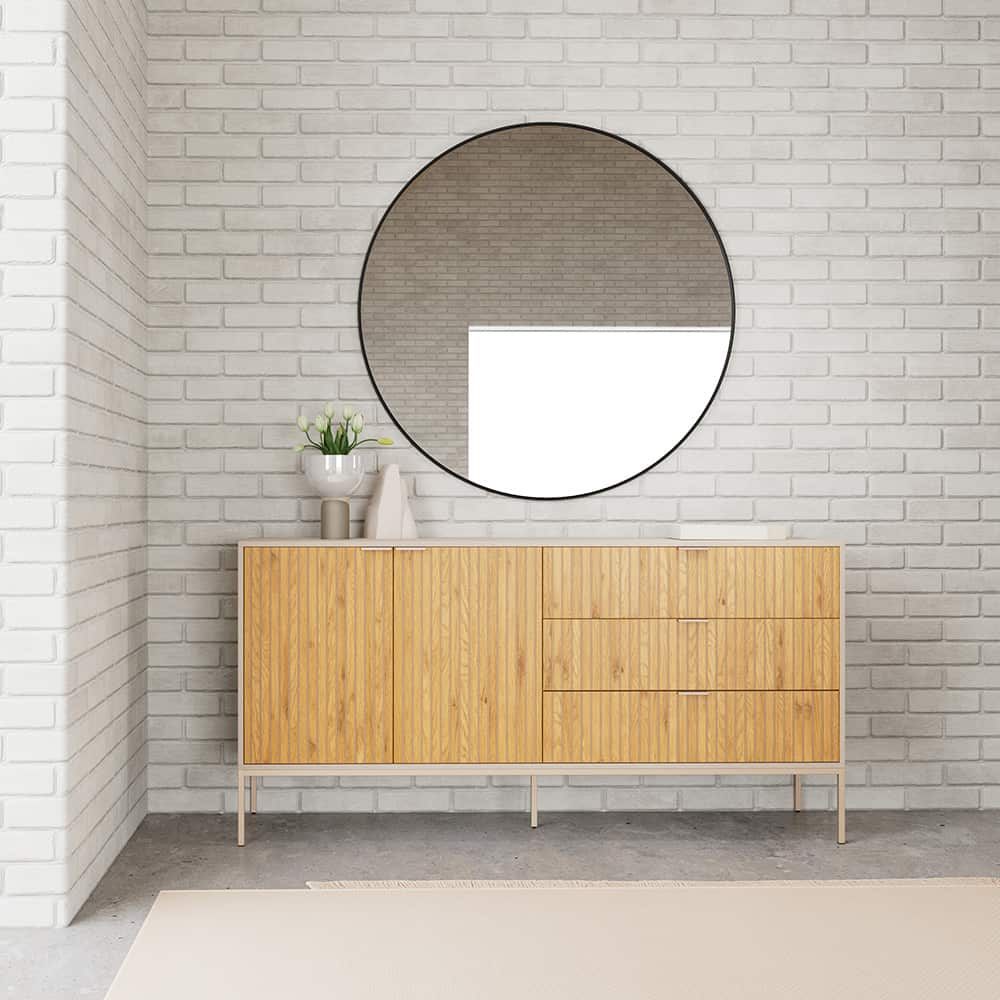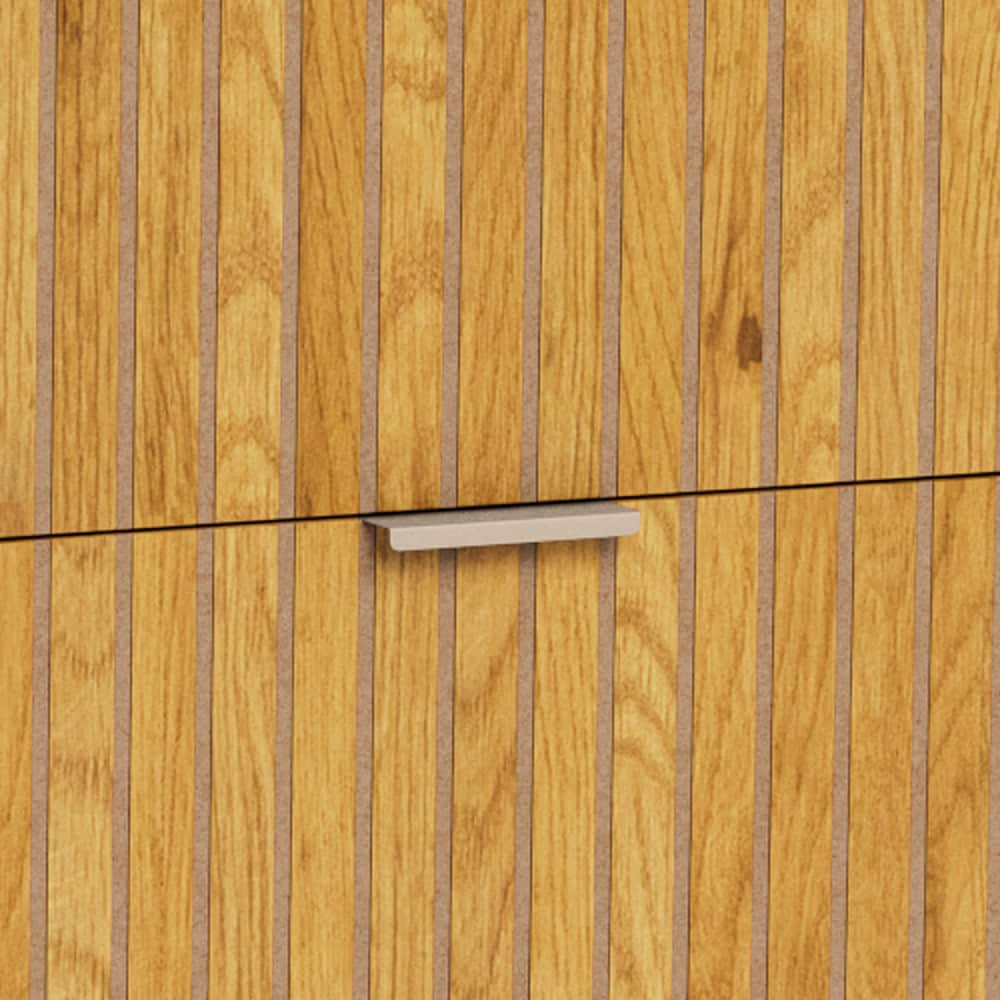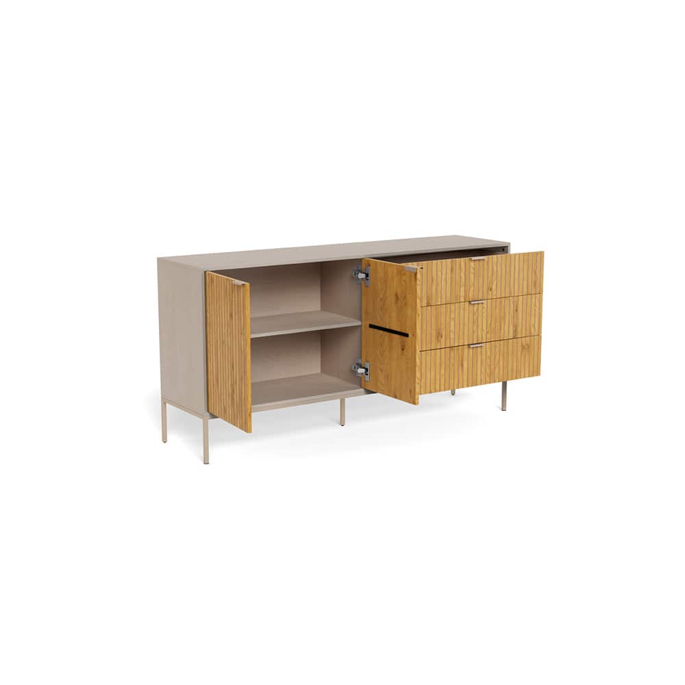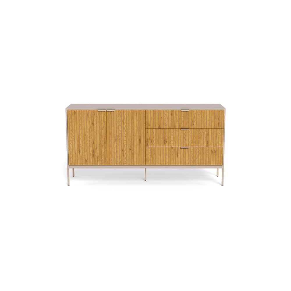 Oldham skjenk kombinerer moderne design med varme naturmaterialer. Frontene med ribbemønster i tre gir møbelet et stilrent og eksklusivt uttrykk, mens de rene linjene og de slanke bena skaper et lett og elegant preg.
