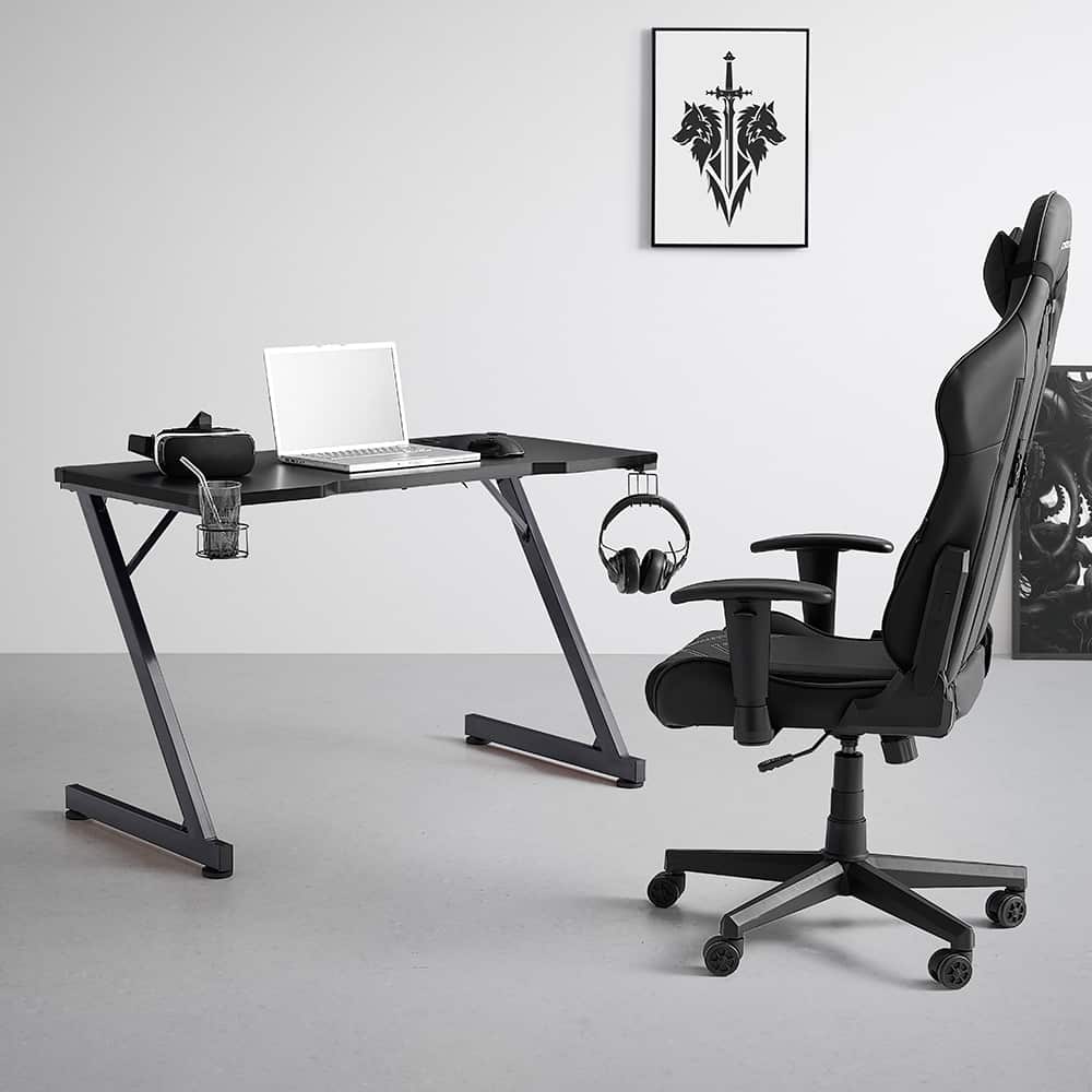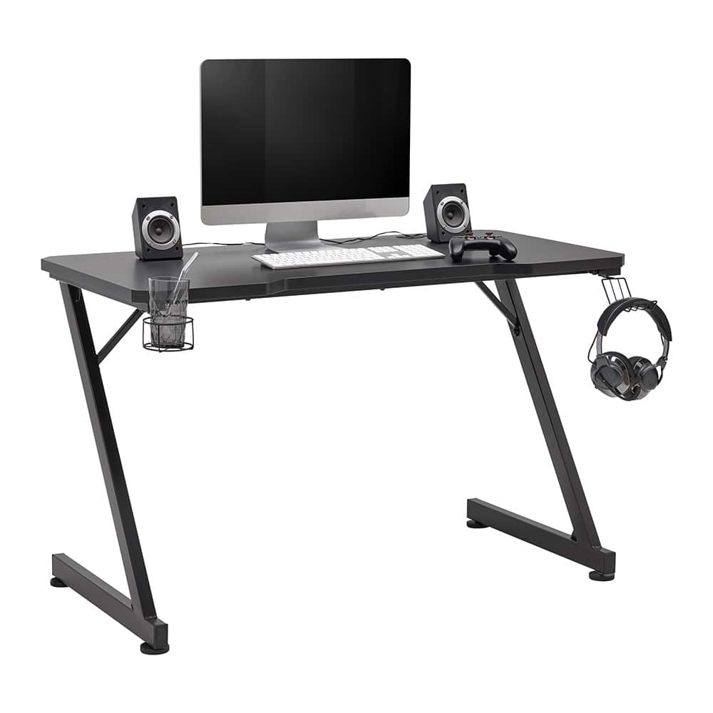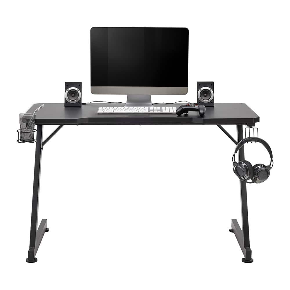 Opplev ultimat komfort og stil med vårt svarte gamingskrivebord. Spillbordet er laget av en kombinasjon av metall og konstruert tre. Den flate presstoppen er ferdigbehandlet med en robust melaminoverflate som garanterer holdbarhet og enkel vedlikehold.