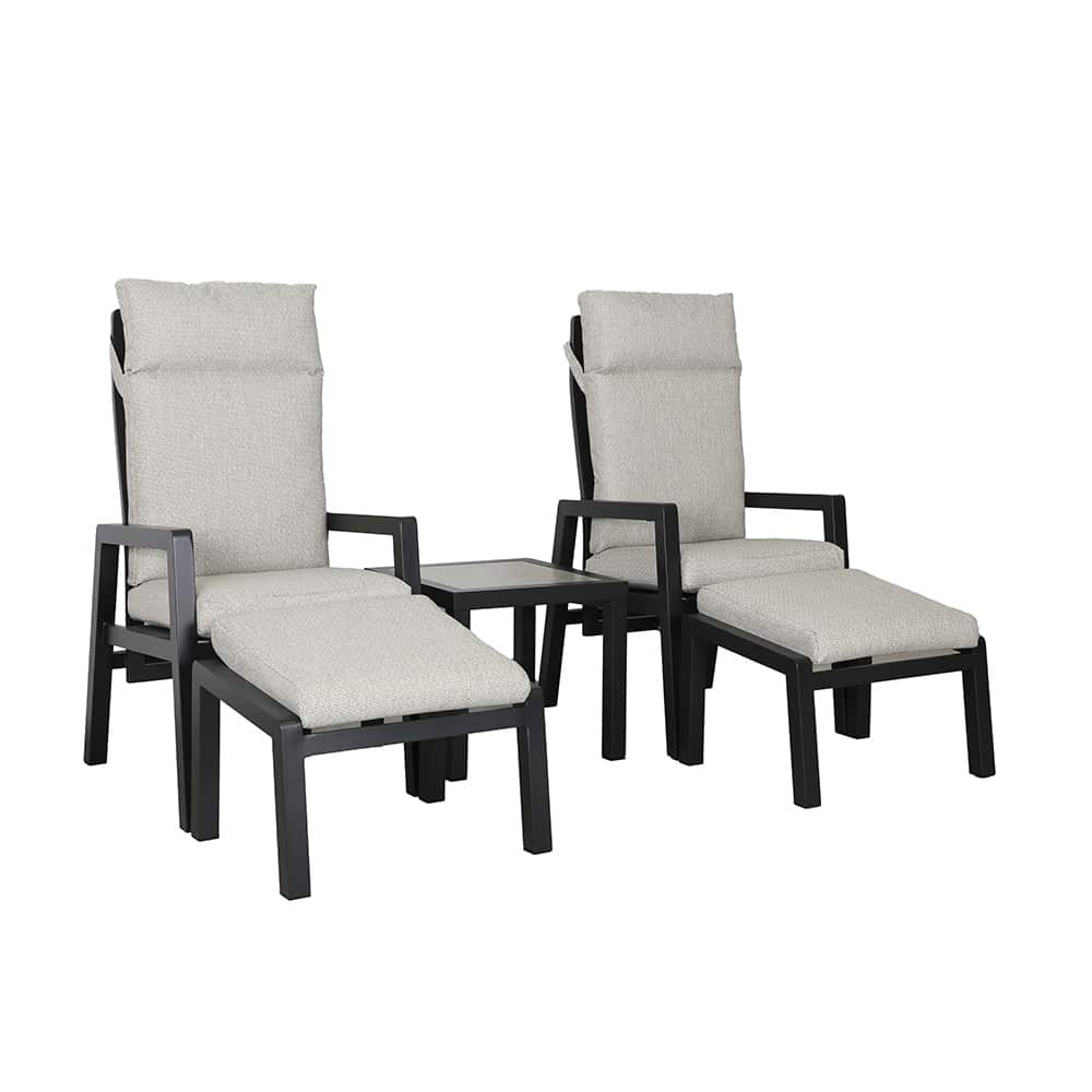 Risør reclinergruppe gir deg ekte avslapning på terrassen. Gruppen består av to komfortable reclinerstoler med fotstøtte og et praktisk bord mellom stolene – perfekt når du vil nyte en kopp kaffe, lese en bok eller bare lene deg tilbake i solen.