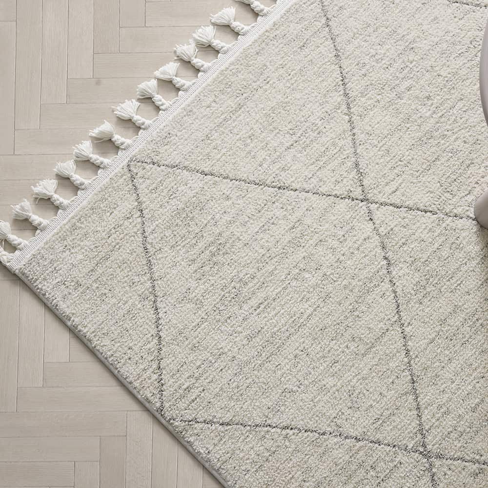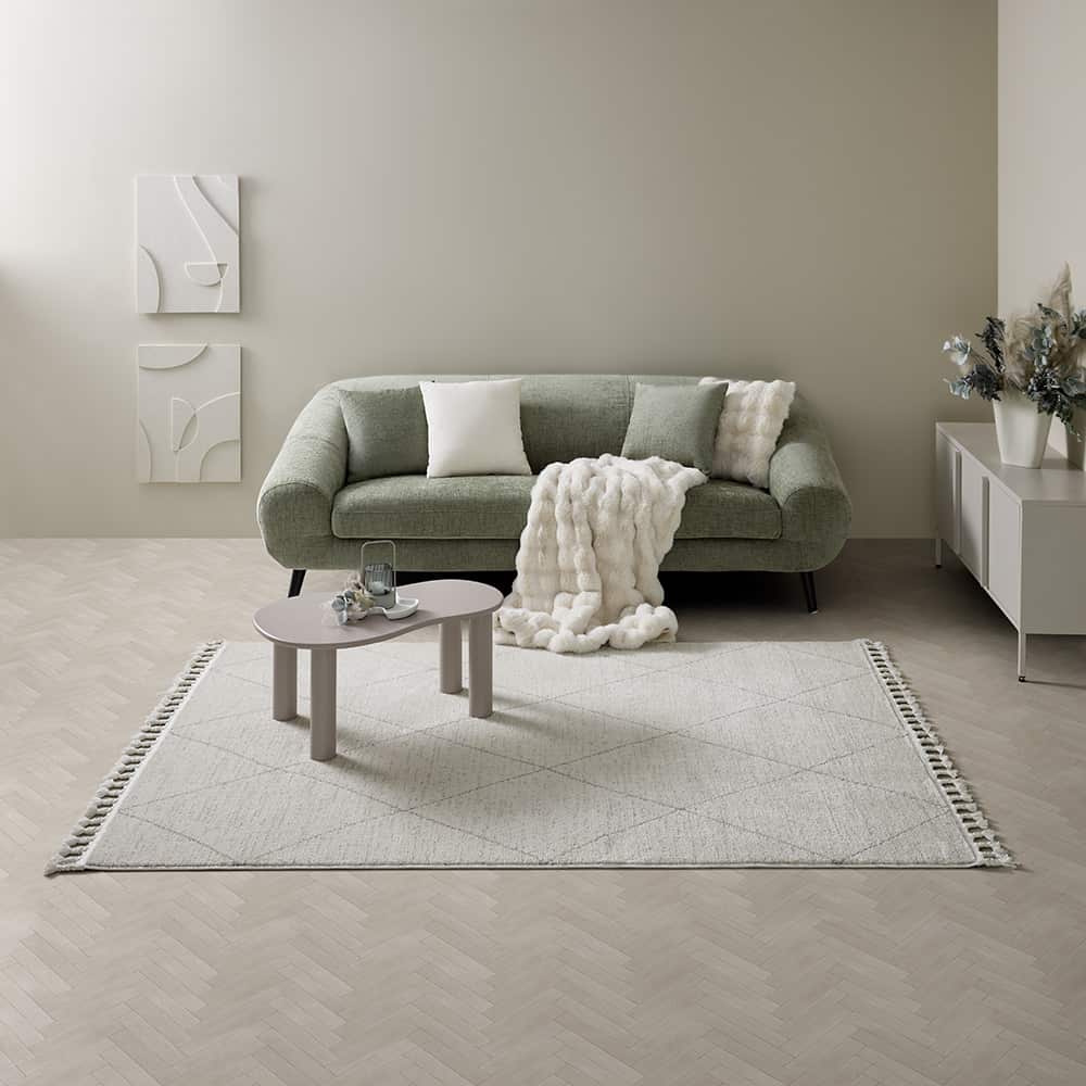 Mykt og behagelig teppe i en lys, nøytral fargetone som gir rommet et lunt og harmonisk uttrykk. Den enkle og tidløse designen gjør at teppet passer godt inn i de fleste interiørstiler. Dekorative frynser på kortsidene gir et ekstra elegant preg, samtidig som teppet skaper en varm og innbydende atmosfære i stuen.